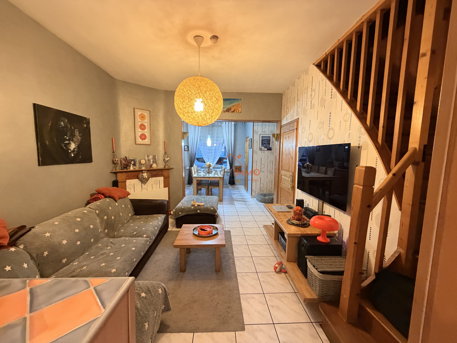 Découvrez cette agréable maison mitoyenne offrant des espaces fonctionnels et lumineux. Au rez-de-chaussée, vous trouverez une entrée avec placard, une salle à manger conviviale, un salon confortable, ainsi qu’une cuisine équipée. Une salle de bain moderne avec douche et meuble vasque et des toilettes indépendantes avec lave-mains complètent ce niveau.