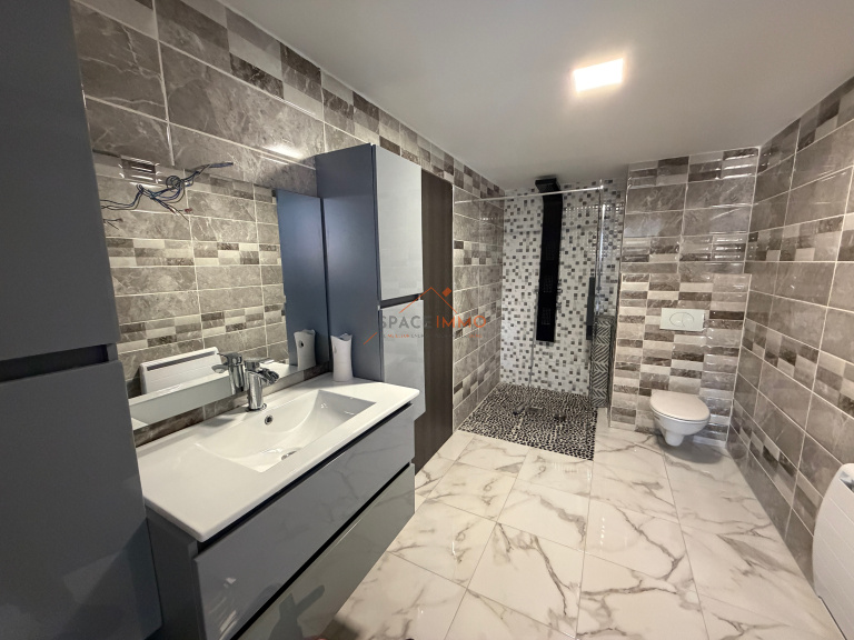 Une salle de bains avec douche à l’italienne, meuble vasque et WC complète ce niveau.