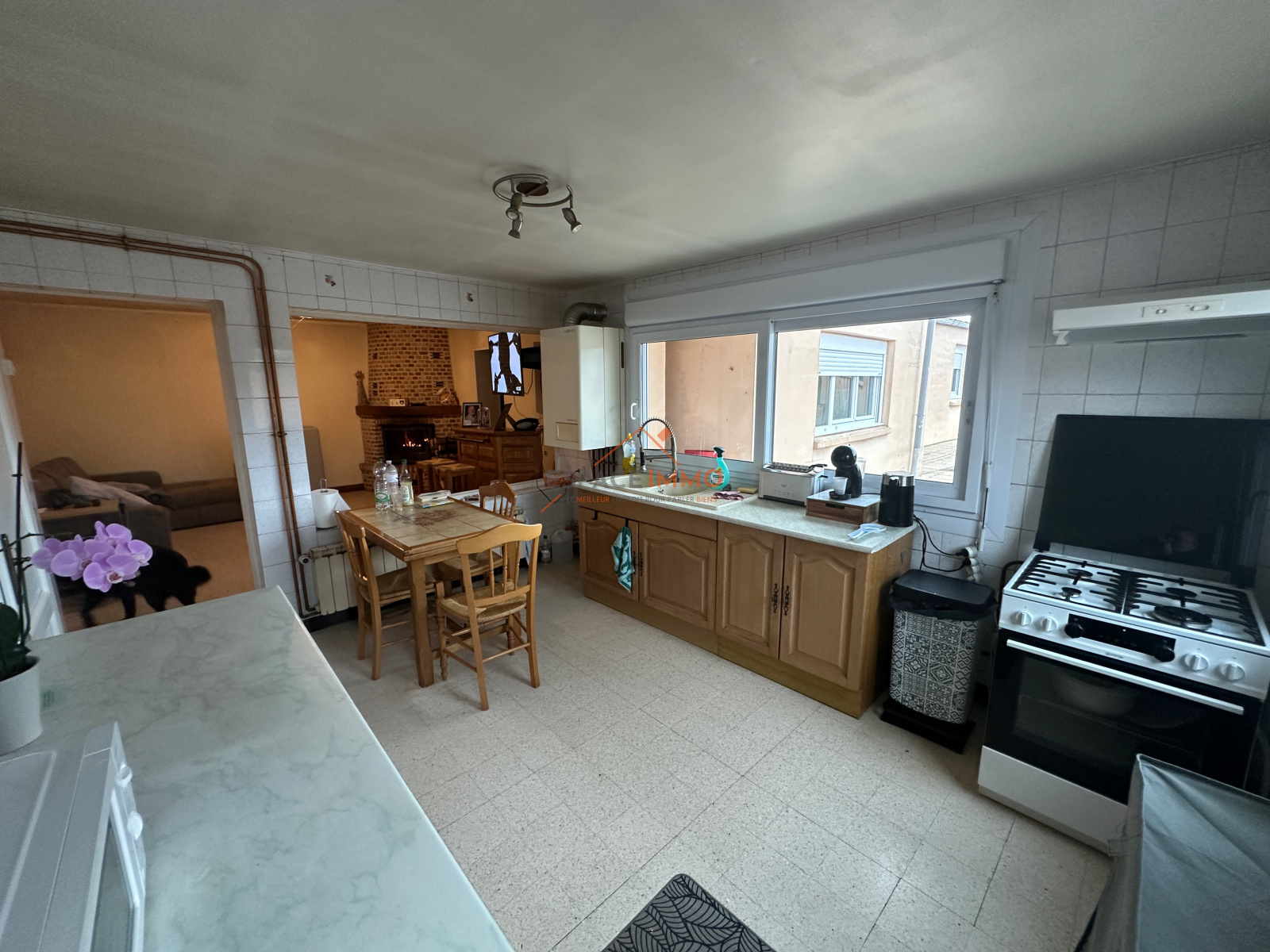Salon avec cheminée à insert bois